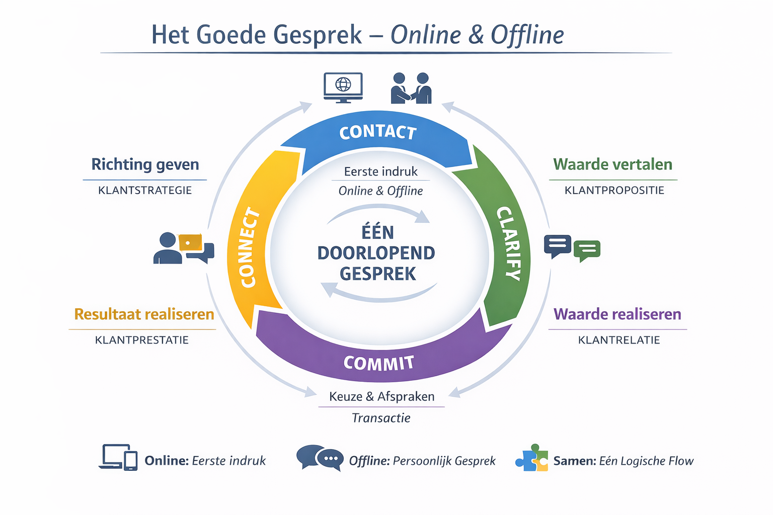 Onze methode maakt geen onderscheid tussen online en offline, maar kijkt naar de kwaliteit van het gesprek in elke vorm. De 5C-methodiek helpt om ook digitale interacties te zien als onderdeel van één doorlopend gesprek met de klant.
